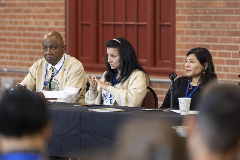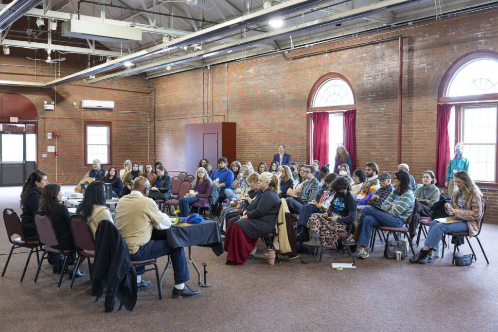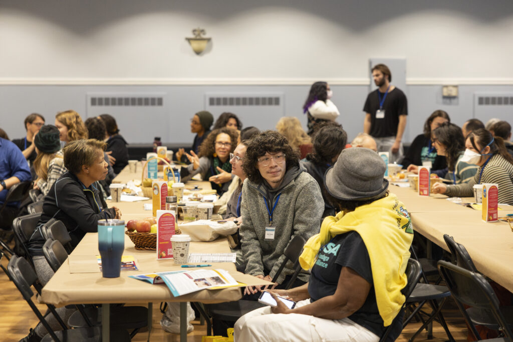 Attendees also ventured up to our 2nd floor gallery, a contemplative space curated to reflect back on the growing movement and collective power of the SOFSA network. Visual notetaking posterboards from past Food Justice Gatherings, an expansive photo gallery, community listening session report-backs, and an interactive art piece based on the Interwoven theme all knit together the story of our region’s food system community.