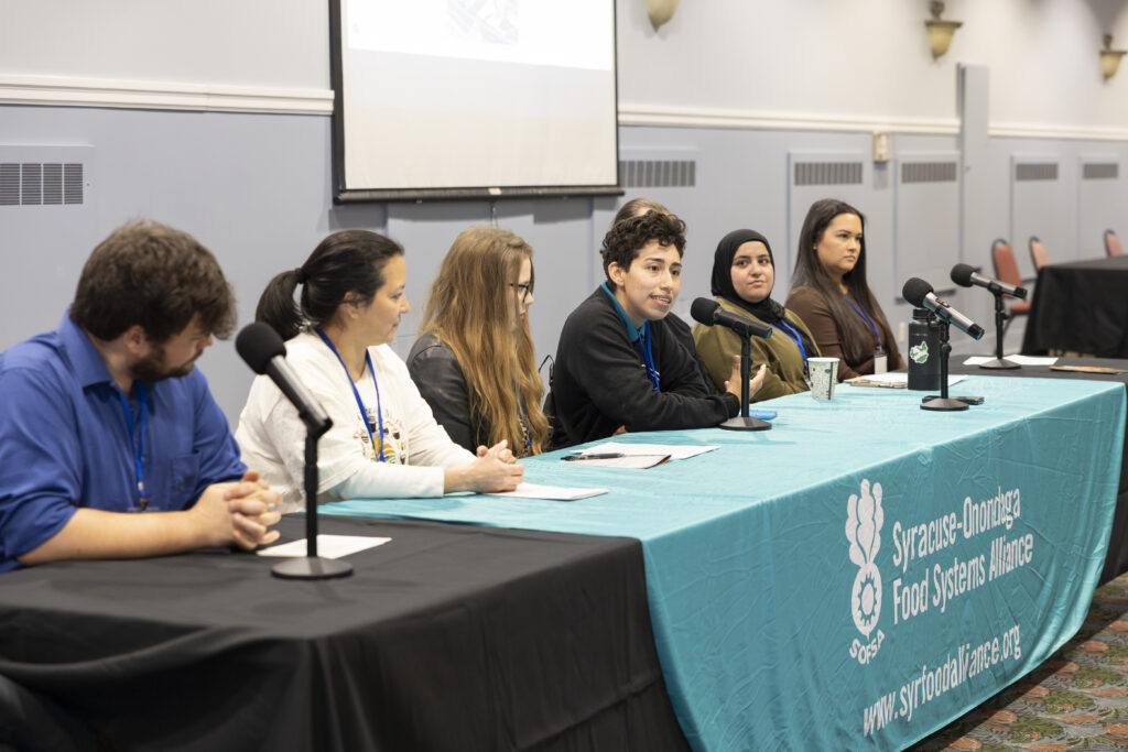 Following the Opening Ceremony, attendees moved into their choice of three breakout sessions. In collaboration with Syracuse University’s Engaged Humanities Network, a panel session: Environmental Storytelling Central New York featured local farmers and food advocates Mike Atkins and Monu Chhetri along with Mariaelena Huambachano (author of Recovering Our Ancestral Foodways and member of the UN Permanent Forum on Indigenous Issues) for a public conversation on the role of storytelling in building food sovereignty. Grounded in the experiences of their communities, panelists shared strategies and visions for re-rooting food systems in relationship, reciprocity, and care.