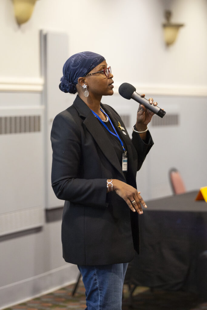 After morning sessions wrapped up, attendees returned to the Martha Eddy room for lunch. A delicious meal catered by Toss n Fire even highlighted a collaboration with Salt City Harvest Farm with a specialty pizza featuring their gai lan, mustard greens, garlic, and daikon radish. Lunch offered time to connect over food and also featured programming that highlighted the people and programs that seek to improve CNY food systems. It began with a mini keynote by Damali Wynter, Assistant Commissioner of NY Ag & Market. Wynter emphasized the importance of relationship-building with the state and letting the state know what is and is not working.