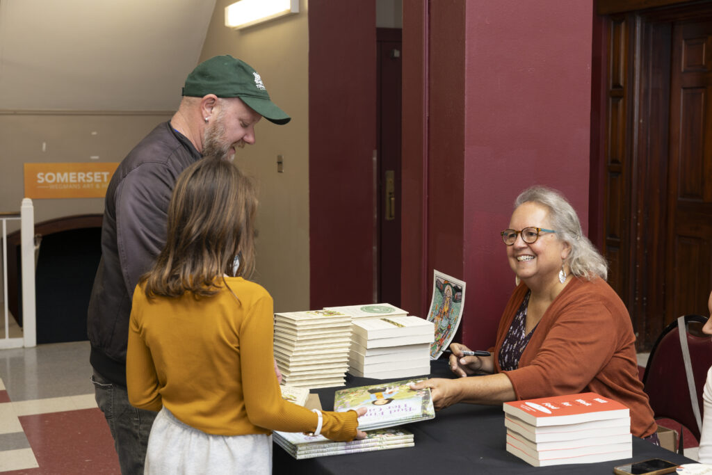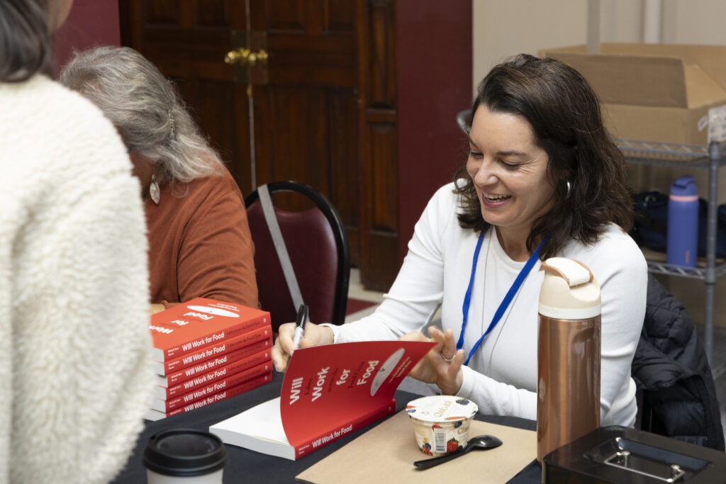 A book signing featuring Robin Wall Kimmerer and Laura-Anne Minkoff-Zern, supported by publisher Parthenon Books, also took place during the morning breakout sessions. Attendees waited in a long yet energized line to purchase books from the authors including Wall Kimmerer’s Braiding Sweetgrass, The Serviceberry, and her children’s book, Bud Finds Her Gift as well as Minkoff-Zern’s Will Work for Food, which examines the essential role and exploitation of frontline workers across the food chain.
