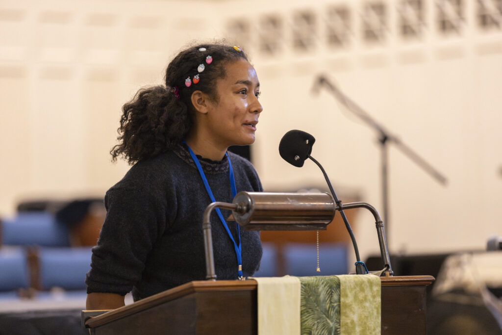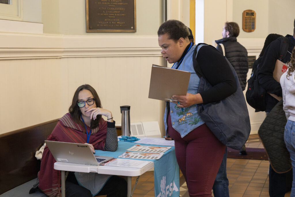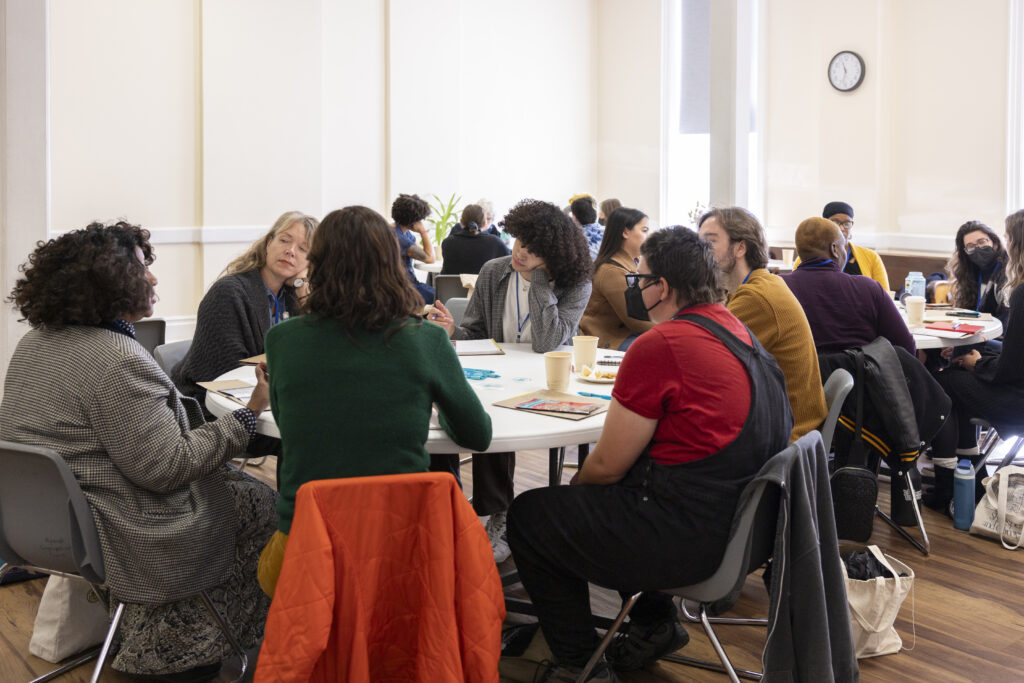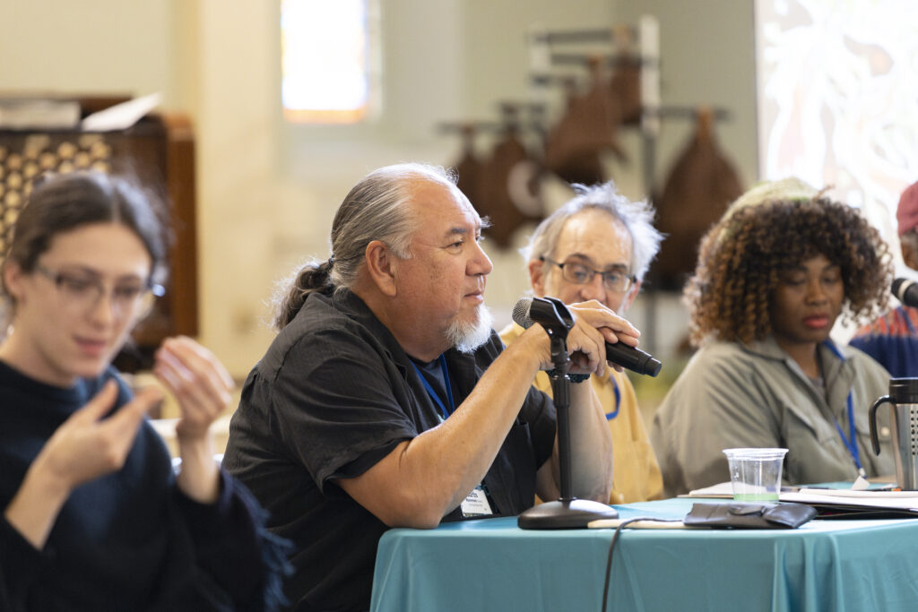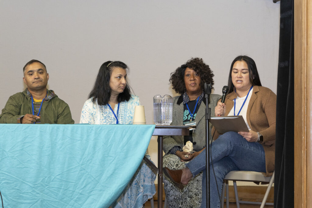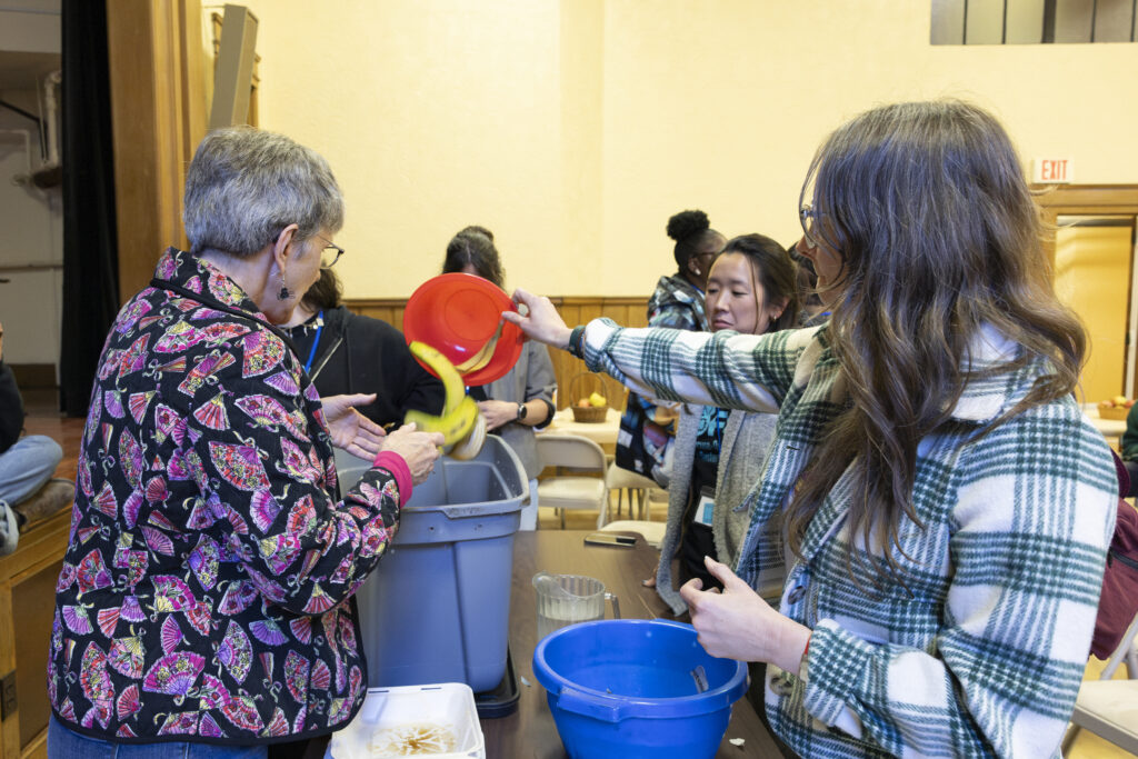 As lunch wrapped up, Elise Springuel of Onondaga Food Rescue Network explained how the organization rescues and distributes food to reduce food waste and support emergency food access. Throughout the day, OFRN recovered untouched food from the gathering and delivered it to the Rescue Mission Alliance. As lunch came to a close, folks were ushered into the afternoon session of their choice. Angela Ferguson of the Onondaga Nation Farm demonstrated how to process corn while sharing stories of indigenous resilience through food. Attendees gathered with Maura Ackerman to learn how to leverage their personal stories to advance advocacy campaigns. Back in the Sanctuary, in a session moderated by Renee Marcoux, activists spoke about how to pursue environmental justice in the face of climate change and economic and racial injustices.
