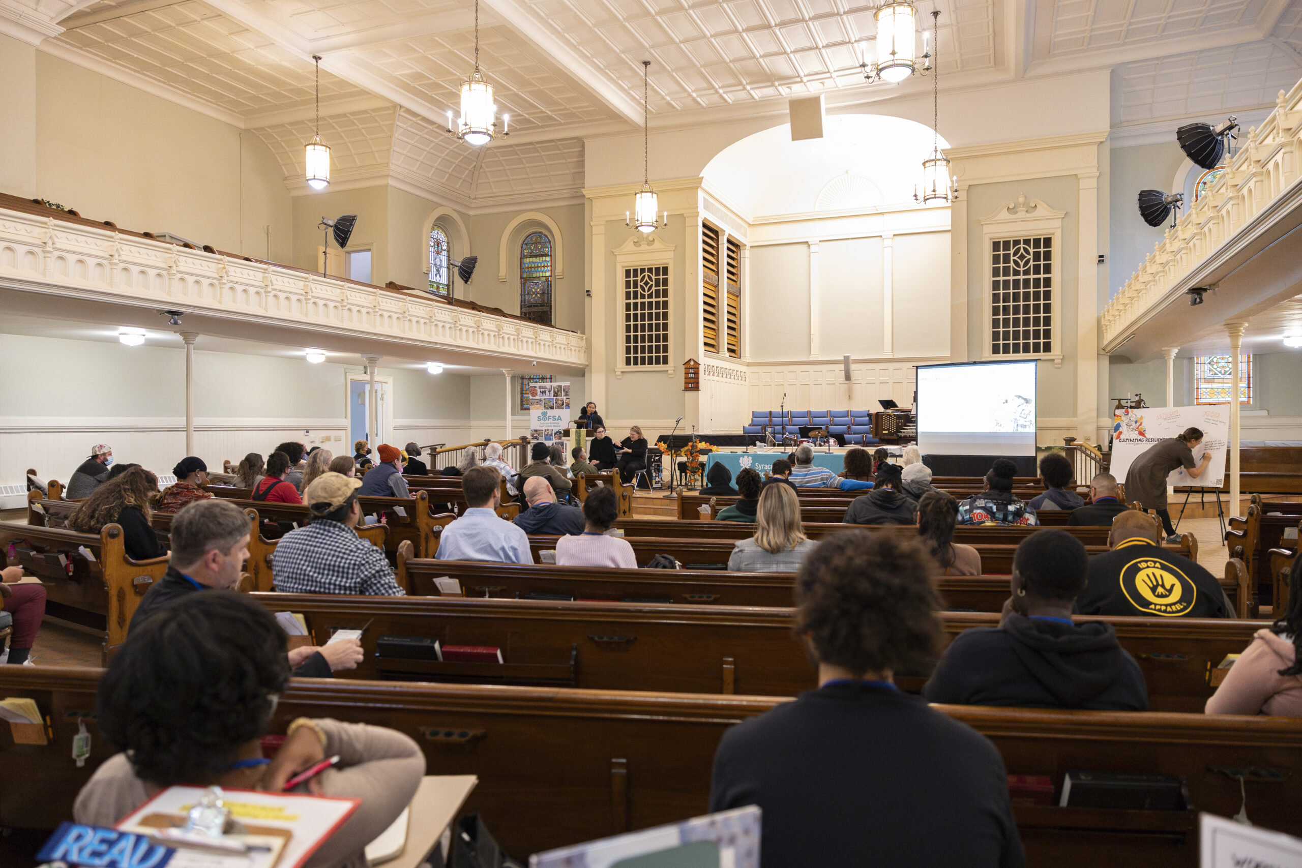 Following the opening ceremony, attendees could choose between 4 different sessions. In the Sanctuary, Micah Orieta moderated SOFSA’s first Spanish-interpreted panel, where panelists shared about the importance of worker organizing and drew connections across immigration status, policy, precarity, and community support. Charles Carrier, in Memorial Hall, convened urban farmers to talk about the challenges and opportunities in pursuing food justice through urban agriculture. In the workshop spaces, Adult Ed and Kirtland Hall, Avalon Gupta-VerWiebe led folks in making ginger bug sodas, while Tim Bryant and Maria Bianchetti facilitated a survey of at-home composting practices.