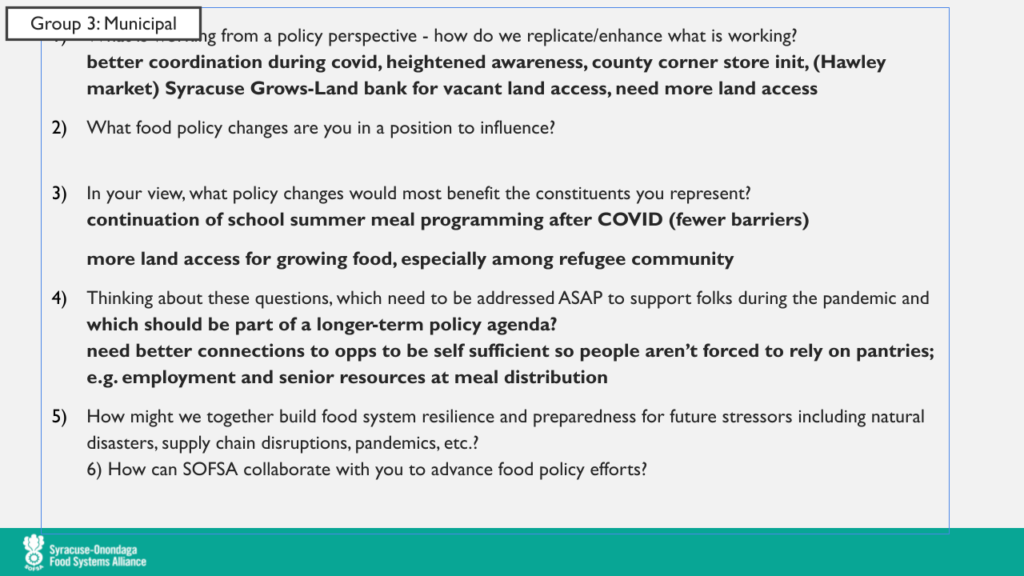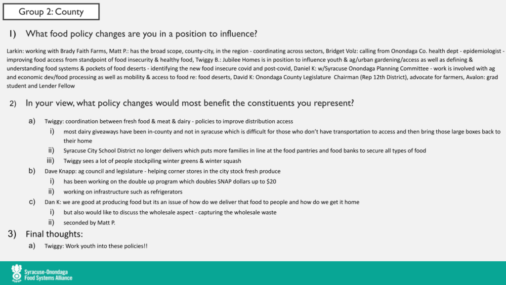 The meeting ended with a brief presentation from Matt Potteiger, Professor of Landscape Architecture at SUNY College of Environmental Science and Forestry, on Food Plan CNY, which has recently released an executive summary of their policy recommendations. Click here to learn more.