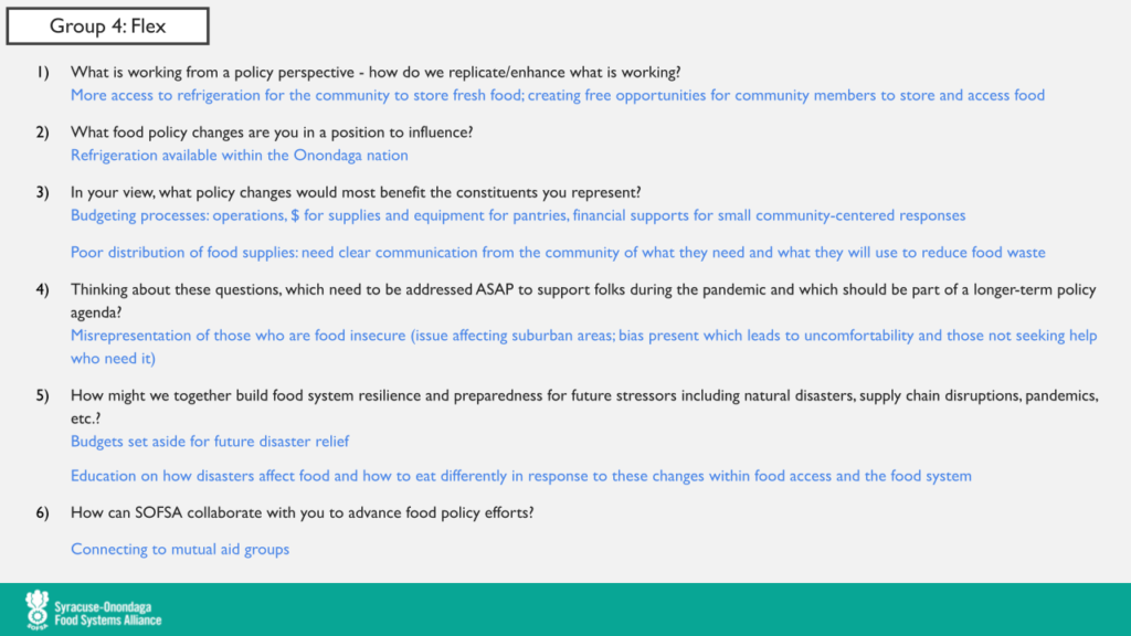With the pumps primed, the group split into breakout sessions based on the level of government policy they were most interested in discussing. Separate discussions were held for state-level, county-level, and local-level policy, with a fourth room open for folks of various interests. When the rooms closed, the groups reconvened, and shared back about their conversations. Scroll through the gallery below to see the notes from each breakout group, taken by gracious volunteers from SU’s Lender Center for Social Justice (thanks so much, everyone!).