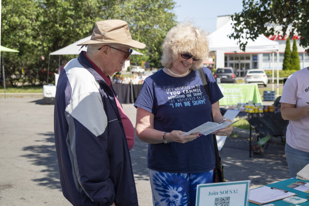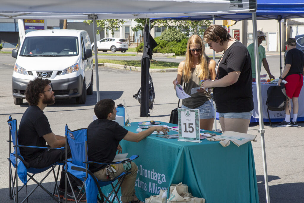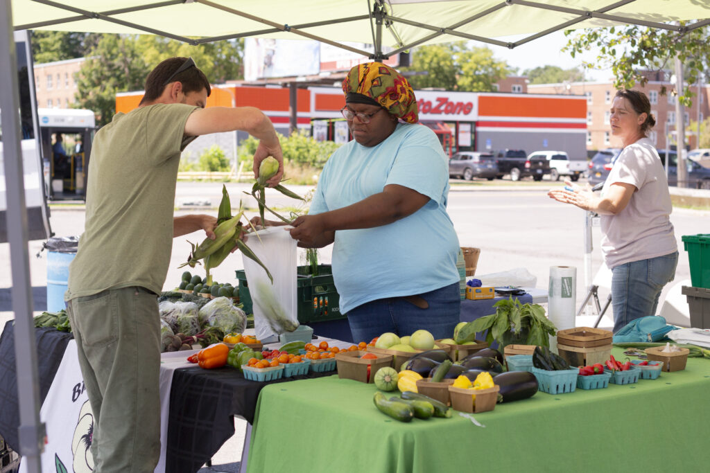 The tour kicked off at the "Hub," where SOFSA tabled along with other community organizations at the Food Access Healthy Neighborhoods Now Saturday Farmers Market. The market is a crucial response to the lack of access to fresh food in the Valley neighborhood of Syracuse, where the only supermarket in the area closed down in 2018. Situated at the Valley Plaza (4141 S Salina St) the market aims to fill in some of this gap by inviting both food vendors like Brady Farm and community organizations who can provide information on health and wellness to patrons. The existence of the market supports and is supported by urban agriculture efforts, as small farms in the area provide fresh produce that patrons can purchase using different government benefits programs.